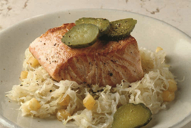 Разогрейте духовку до 180 градусов. Очистите картофель и промойте его.Промойте кислую капусту несколько раз под холодной водой, затем отожмите ее.В чугунной кастрюле на гусином жире обжарьте нашинкованные лук-шалот и репчатый лук. Влейте белое вино, добавьте капусту и рыбный бульон, посолите. Доведите до кипения.Специи заверните в кусочек ткани и положите в кастрюлю. Накройте крышкой и томите в духовке в течение часа.Снимите крышку и положите очищенные картофелины на капусту, накройте и продолжайте готовить ещё 25–30 минут. Капуста должна оставаться слегка хрустящей.Копченую грудинку нарежьте и обжарьте до хрустящей корочки, затем обсушите на бумажном полотенце.На сковороде уварите белое вино с нарезанным шалотом и кумином. Добавьте немного сока от капусты и крем-фреш, уварите до густоты.На оливковом масле обжарьте филе лосося по 3 минуты с каждой стороны, затем посолите и поперчите.Аккуратно достаньте картошку, смешайте капусту, при необходимости добавив соль и перец. Выложите капусту на сервировочное блюдо, сверху положите лосось и полейте соусом. Вокруг разложите целый картофель или нарежьте его кубиками.