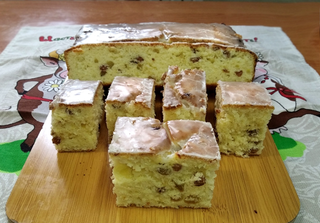 6. Готовый пирог снять с духовки, аккуратно перевернуть на решетку и снять бумагу. Подготовить глазурь, смешав сахарную пудру с лимонным соком, и равномерно нанести на еще горячий пирог.