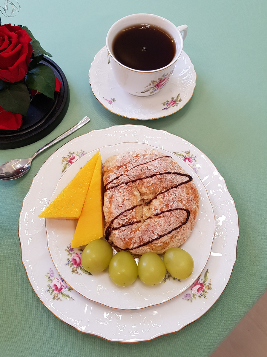 По завершении выпекания, аккуратно переложите пышки на тарелки, полив их расплавленным шоколадом. Для аппетитного оформления добавьте кусочки манго и мускатный виноград.