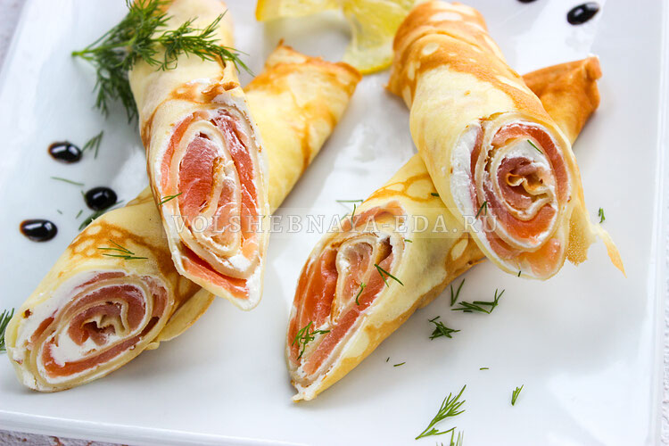 Эти блины с красной рыбой и сливочным сыром можно не только приготовить на Масленицу, но и подать как великолепную закуску на любой праздничный стол. Для этого достаточно нарезать их на небольшие порционные кусочки (по диагонали) и красиво оформить на тарелке.