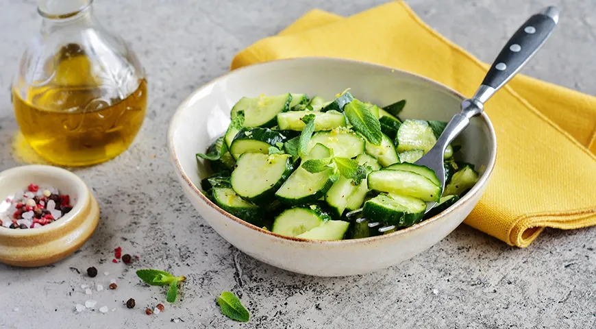 Этот легкий и освежающий салат идеально вписывается в летнее меню. Сочетание огурцов, свежей мяты и лимона создаёт непревзойдённую гармонию вкусов, позволяя насладиться лёгкостью как в обед, так и на ужин.