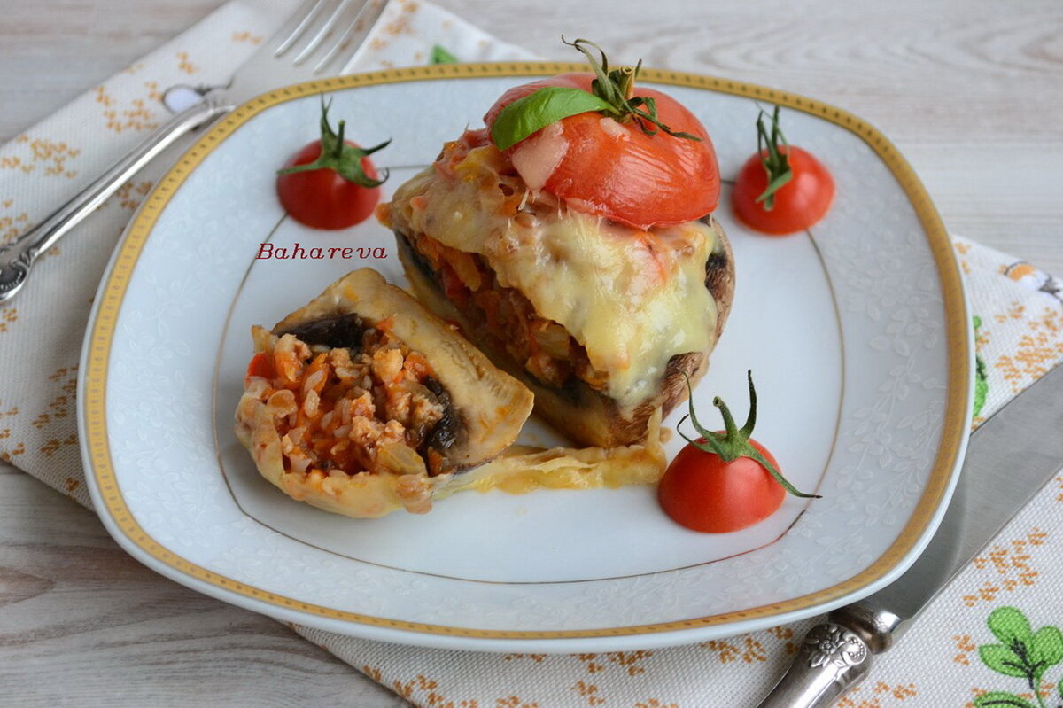 Теперь примемся за грибы. У каждого шампиньона удалить ножку и смазать внутреннюю часть растительным маслом. Наполнить шапочку гриба фаршем, а сверху посыпать тертым сыром и закрыть помидорчиком.