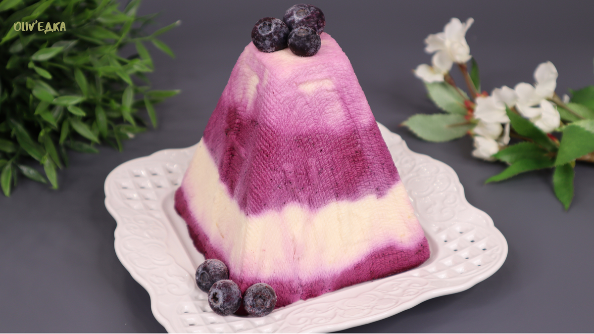 3. Сборка пасхи: Взбейте жирные сливки до пышности и аккуратно добавьте остывшую творожную массу. Разделите на две части: к одной добавьте черничное пюре, а в другую — лимонную цедру. Укладывайте слои в заранее подготовленную пасочницу, застеленную марлей. Готовую смесь уберите в холодильник на 24 часа под грузом.