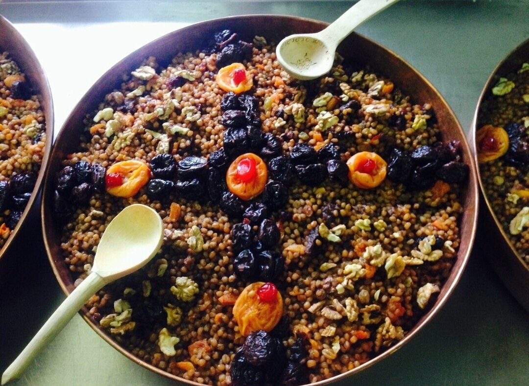 Вымыть пшеницу, оставить на ночь в холодной воде. Утром отварить до раскрытия зерен, добавить подготовленные сухофрукты и орехи. Перемешать с мёдом и оформить блюдо в виде креста, украсив курагой и черносливом.