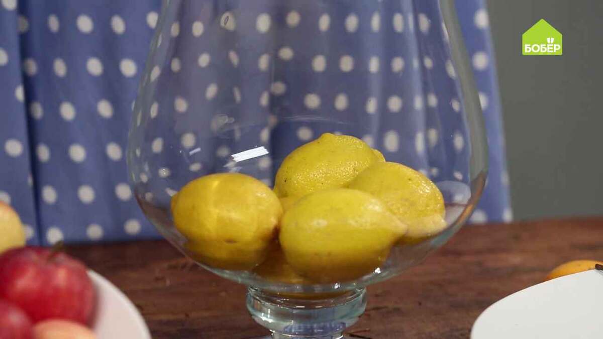 Начать стоит с наполнения большой стеклянной вазы разнообразными фруктами, которые можно укладывать слоями для создания контрастного визуального эффекта. Первым слоем положите лимоны, чтобы добавить яркости.