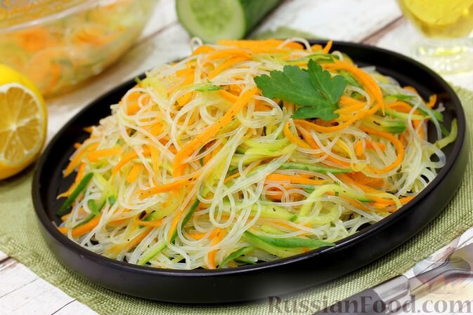 - Фунчоза с морковью по-корейски и огурцами: Ингредиенты включают фунчозу, маринованную морковь и свежие огурцы, приправленные соком лимона и растительным маслом.