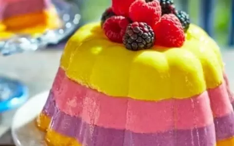 Когда персиковый слой застынет, аккуратно вылейте малиновое желе поверх него, следя за тем, чтобы обе смеси были комнатной температуры. Продолжайте в том же духе для всей цветной композиции. После завершения, оставьте желе в холодильнике до застывания верхнего слоя.