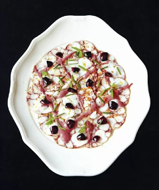 Когда осьминог настоится, нарежьте его на тонкие ломтики и красиво раскладите по тарелкам. Подавайте с соусом, полив оливковым маслом и свежевыжатым соком апельсина. Не забудьте украсить нарезанными оливками и зеленым луком с апельсиновой цедрой для максимального впечатления.