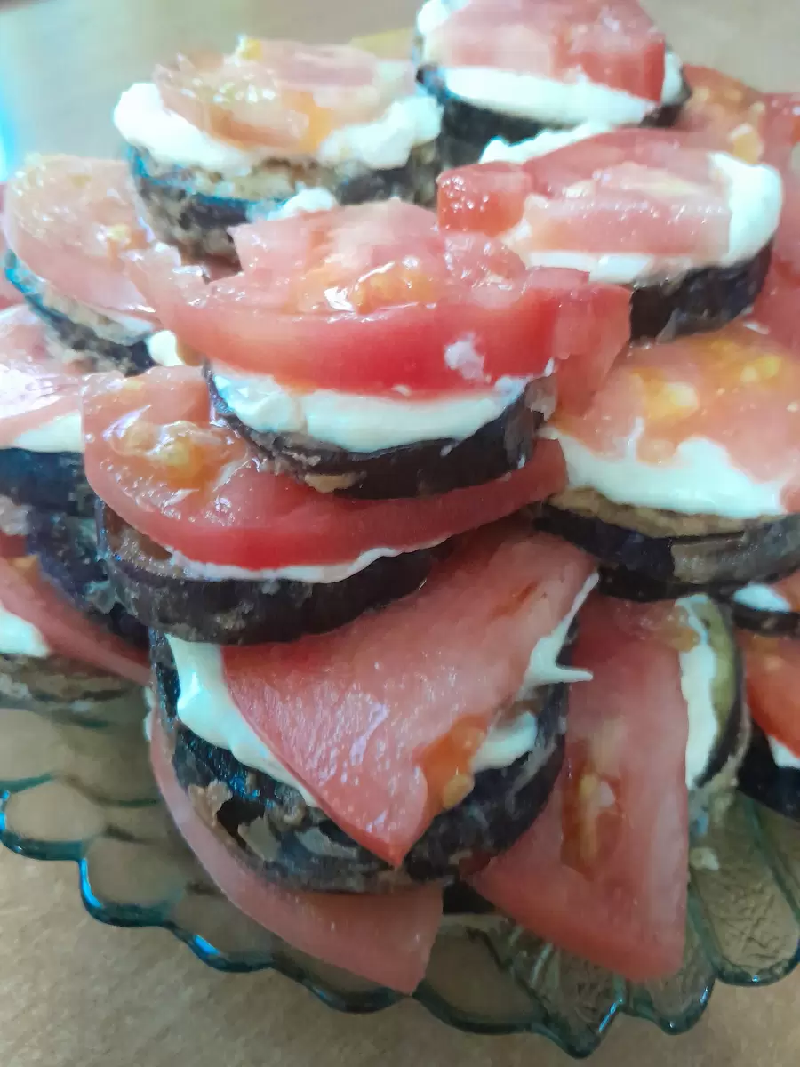 На каждый обжаренный баклажан нанести чесночный майонез и сверху положить дольку помидора.