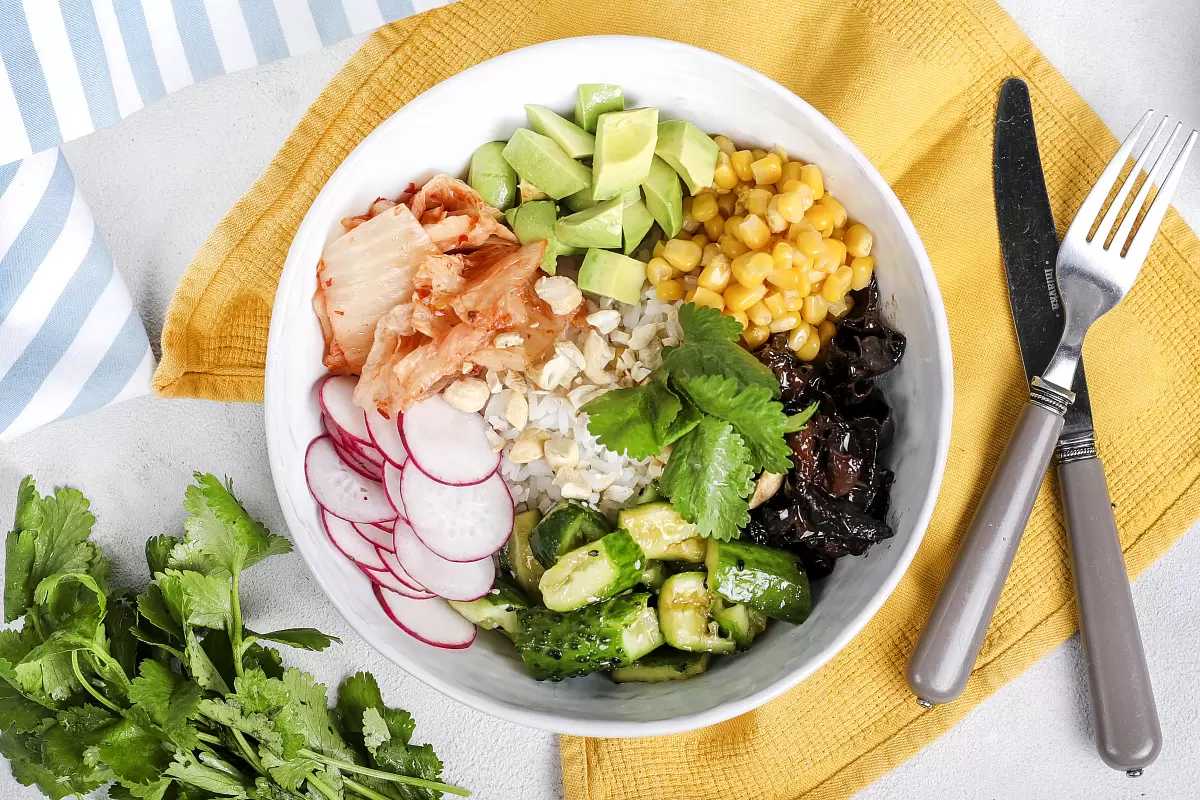 Рис жасмин варить не нужно предварительно. Вскипятите 1,5 литра подсоленной воды, добавьте рис и варите на среднем огне в течение 10-12 минут, постоянно помешивая.После варки откиньте рис на дуршлаг и промойте его теплой водой, чтобы избежать излишней клейкости.Поместите древесные грибы в 300 мл кипятка на 10-15 минут для набухания.Нарежьте редис на тонкие кружочки, а авокадо очистите от кожицы и нарежьте кубиками. Огурцы разрежьте пополам и слегка отбейте.Смешайте рисовый уксус, соевый соус и кунжутное масло в глубокой миске. Добавьте туда огурцы и перемешайте.Поджарьте кешью на сухой сковороде в течение 30-40 секунд, затем порубите крупно.Промойте и обжарьте набухшие древесные грибы на сковороде с 1 ст. ложкой масла на сильном огне, добавьте соус хойсин и готовьте еще 3-4 минуты.Соберите веджи-поке: в глубокой тарелке разложите рис, редис, авокадо, кимчи, кукурузу (без сока), грибы и огурцы по кругу, посыпьте сверху кешью и кунжутом.Запах и цвет этого блюда подавляют все преграды на пути к восхитительному обеду. Приятного аппетита!