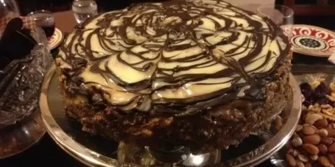 Белый шоколад растапливается, и торт покрывается им. Затем темный шоколад также растапливается и наносится на поверхность в виде узора. Края украшаются миндальными лепестками, и готовый торт ставится в холодильник на несколько часов для пропитки. По желанию украшение можно дополнить физалисом.