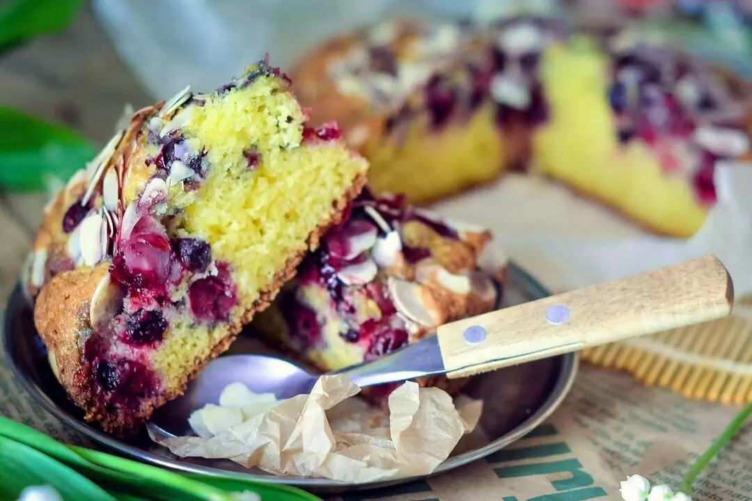 Выложите тесто в форму диаметром 20 см, ровно распределяя по всей поверхности. Сверху разместите свежие ягоды, посыпьте их тростниковым сахаром и миндальными лепестками. Поставьте пирог в заранее разогретую до 180°C духовку на 1 час. Как только пирог подрумянится, дайте ему немного остыть в форме, затем переложите на решетку для полного охлаждения.