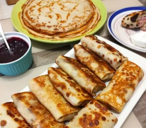 - Блины – с вареньем, сметаной или начинками, которые можно комбинировать по собственной фантазии.