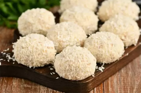 6. Спустя полчаса масса затвердеет. Сформируйте из неё небольшие шарики и обваляйте в оставшейся кокосовой стружке.