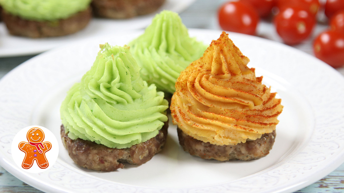 3. Теперь пора собирать стожки. Сформируйте из мясной смеси небольшие лепешки, в центр каждой поместите кусочек сыра Моцарелла. Затем оберните их картофельным пюре, придавая форму стожка.