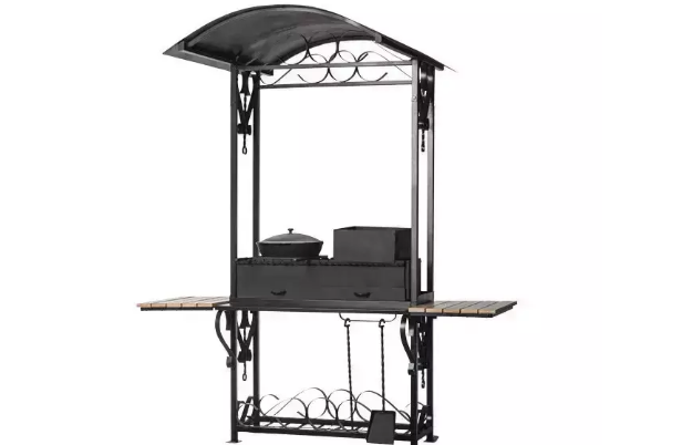 Специально разработанная конструкция мангала предлагает небольшие столики с обеих сторон для размещения необходимых принадлежностей. Один из них оборудован крюками для кулинарных инструментов, а под мангалом предусмотрено место для угля или дров. Дополнительным преимуществом является съёмное кольцо, на которое можно установить казан.