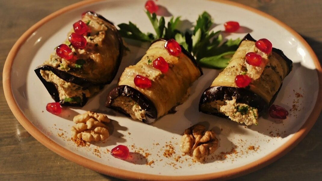 Для этого блюда понадобятся: баклажан (1 шт.), грецкие орехи (200 г), чеснок (2 зубчика), свежая кинза (3 веточки), оливковое масло (50 мл) и соль. Баклажаны нарезают вдоль и обжаривают до золотистой корочки. Затем остужают и наполняют ореховой пастой, приготовленной из орехов, масла, чеснока и кинзы.