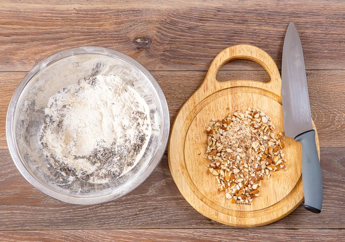 Шаг 1: Предварительно разогреть духовку до 180°C. Мелко нарезать миндаль. В глубокой миске просеять 240 г муки с разрыхлителем, добавить лаванду, миндаль и щепотку соли, тщательно перемешать.