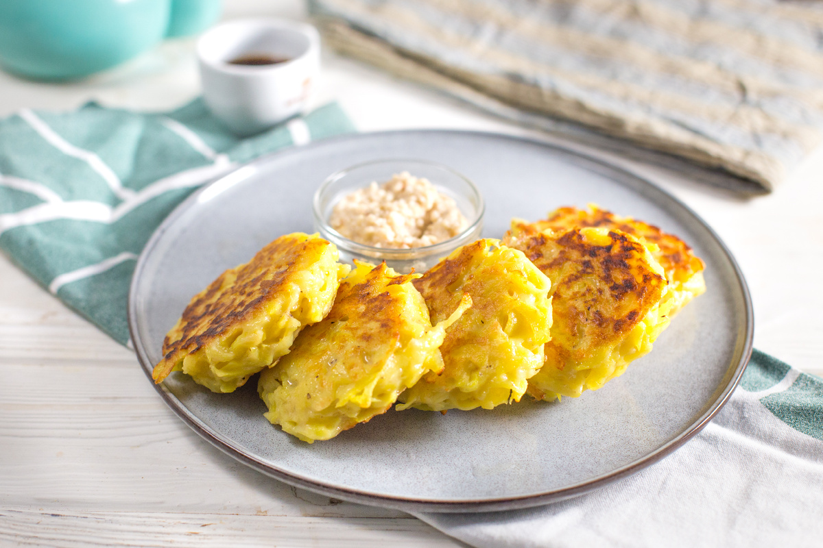 Шаг 3: Разогреть сковороду с 1 ст.л. растительного масла. Сформировать из картофельной массы небольшие лепешки и выложить их на сковороду, обжаривая по 3-4 минуты с каждой стороны. Если оладьи не пропеклись, можно довести их до готовности в духовке, разогретой до 200 градусов, в течение 5 минут.