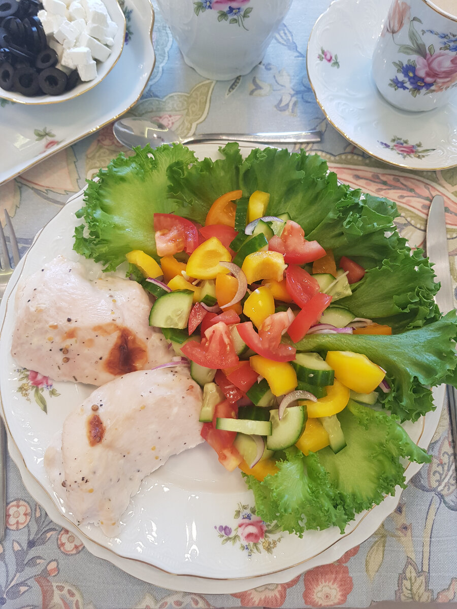 Когда куриное филе готово, подавайте его на листьях салата, дополненными овощной нарезкой. Рядом разместите контейнеры с сыром и оливками, а также соусы — так каждый сможет дополнить свой салат по вкусу.