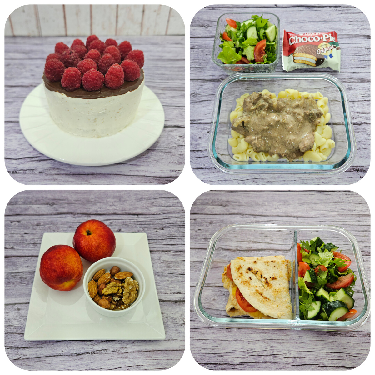 Для крема творог смешивается с арахисовой пастой и подсластителем, после чего коржи пропитываются молоком и смазываются кремом. Слой за слоем формируется тортик, который оставляется в холодильнике. После застывания глазурь готовится из шоколада и молока, и украшается малиной.