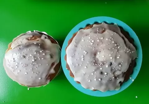 Слегка остывшие куличи щедро смазывайте глазурью, сверху присыпьте кондитерскими украшениями. Пусть всё это застынет, и ваши куличи будут готовы к праздничному столу!