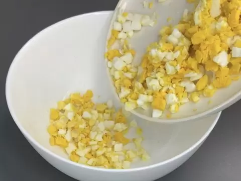 Для начала необходимо сварить яйца вкрутую, очистить их и нарезать кубиками. Затем добавьте «заменяемый» основной продукт — копченую куриную грудку, которую при желании можно поменять на кальмары, вареную курицу или даже сырокопченую колбасу. Выбор зависит от ваших предпочтений и настроения.