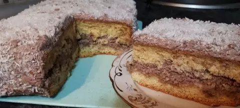 Когда бисквит остынет, аккуратно разделите его пополам. Для пропитки можно использовать комбинацию из 1 ст. ложки сгущенного молока с 50-70 мл воды. Наполните торт кремом с кокосом, а сверху покройте слоем крема без кокоса. Завершите оформление, посыпав верх торта оставшейся кокосовой стружкой. Этот аппетитный десерт обязательно станет любимым в вашей семье!