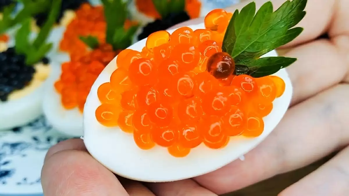 Завершите оформление яиц, украсив их икрой и зеленью. Икру можно выбрать на любой вкус — даже мойва или минтай подойдут как недорогие и вкусные варианты. Такой подход не только удобен, но и позволяет проявить креативность в подаче блюда. Приятного аппетита!
