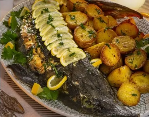 Переложите рыбу на сервировочное блюдо, рядом разместите картофель, украсьте лимонными полукружьями и подавайте в сочетании с хреном.