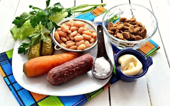 Смешайте в салатнике запечённую морковь, белую фасоль, колбасу, огурцы и измельчённые травы. По вкусу добавьте соль и заправьте получившимся соусом. Подавать рекомендуется в виде горки или, если удобно, с использованием сервировочного кольца. Перед подачей щедро посыпьте хрустящими ржаными сухариками — так салат приобретет финальный штрих и идеально дополнит любой праздничный стол. Каждое блюдо становится особенным, когда оно приготовлено с душой!