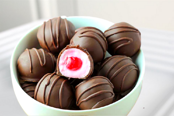 Смешайте мягкое сливочное масло, 250 г сахарной пудры и вишневый сок с помощью миксера. Постепенно добавляйте оставшуюся сахарную пудру, пока не получится однородная масса. Поставьте в холодильник на 30 минут. Затем сформируйте шарики с вишенкой внутри, укладывая их на пергаментный лист. После этого уберите их в морозильник на полчаса.